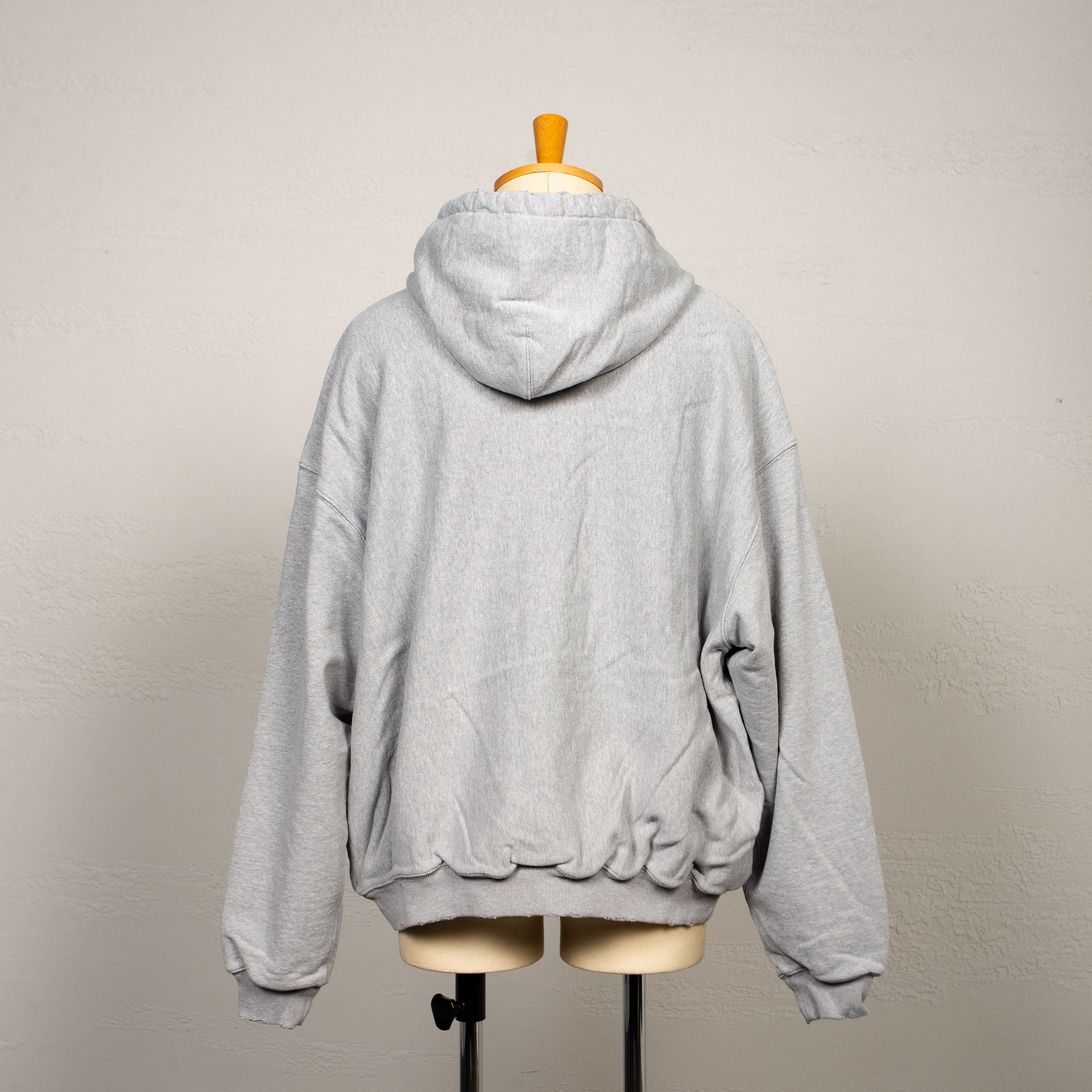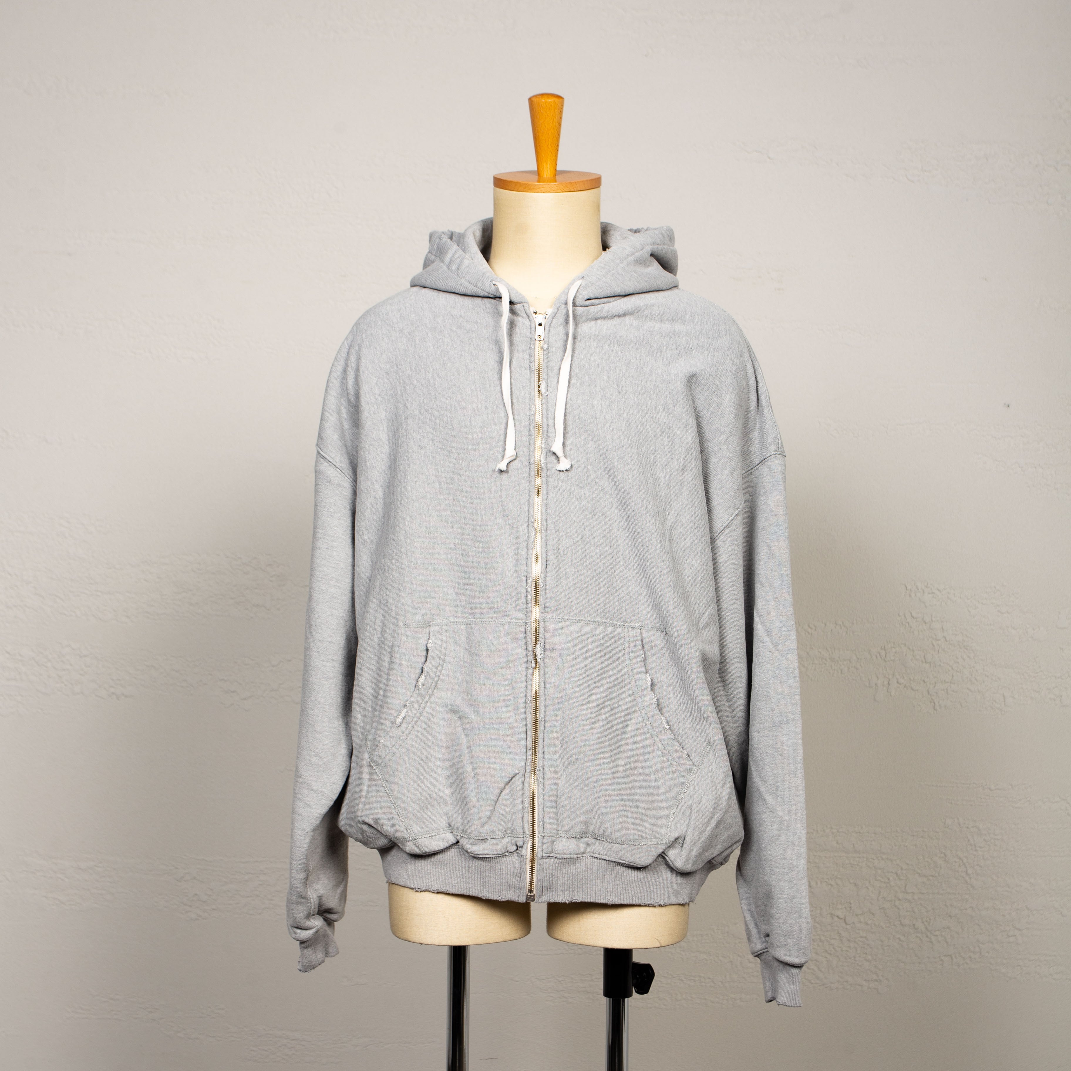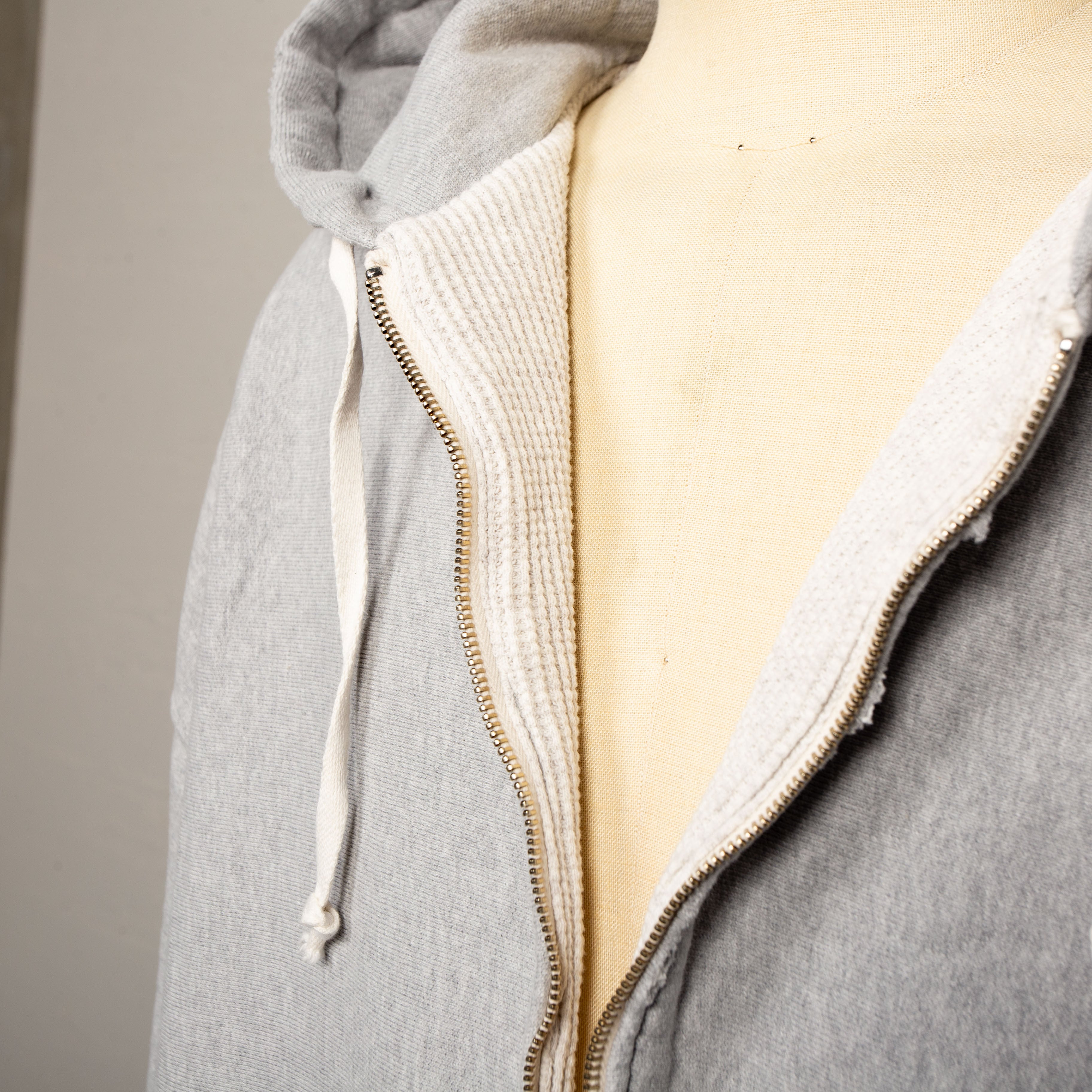 "オリジナルの空紡糸を使用し、シャリ感とドライな風合いを持たせた度詰め生地のフーデッドジップフーディ。裏地にはワッフル素材を貼り合わせることで適度な厚みを持たせ、アウターとしても活躍する仕様に仕上げています。
