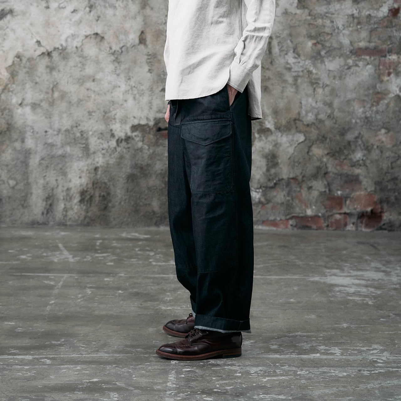 様々なヨーロッパミリタリーパンツから着想を得て製作した、SUS-SOUS大定番のMK-1トラウザーズ。スーピマコットンのデニム生地を使用し、ゆったりとしたワイドシルエットに仕上がっている。