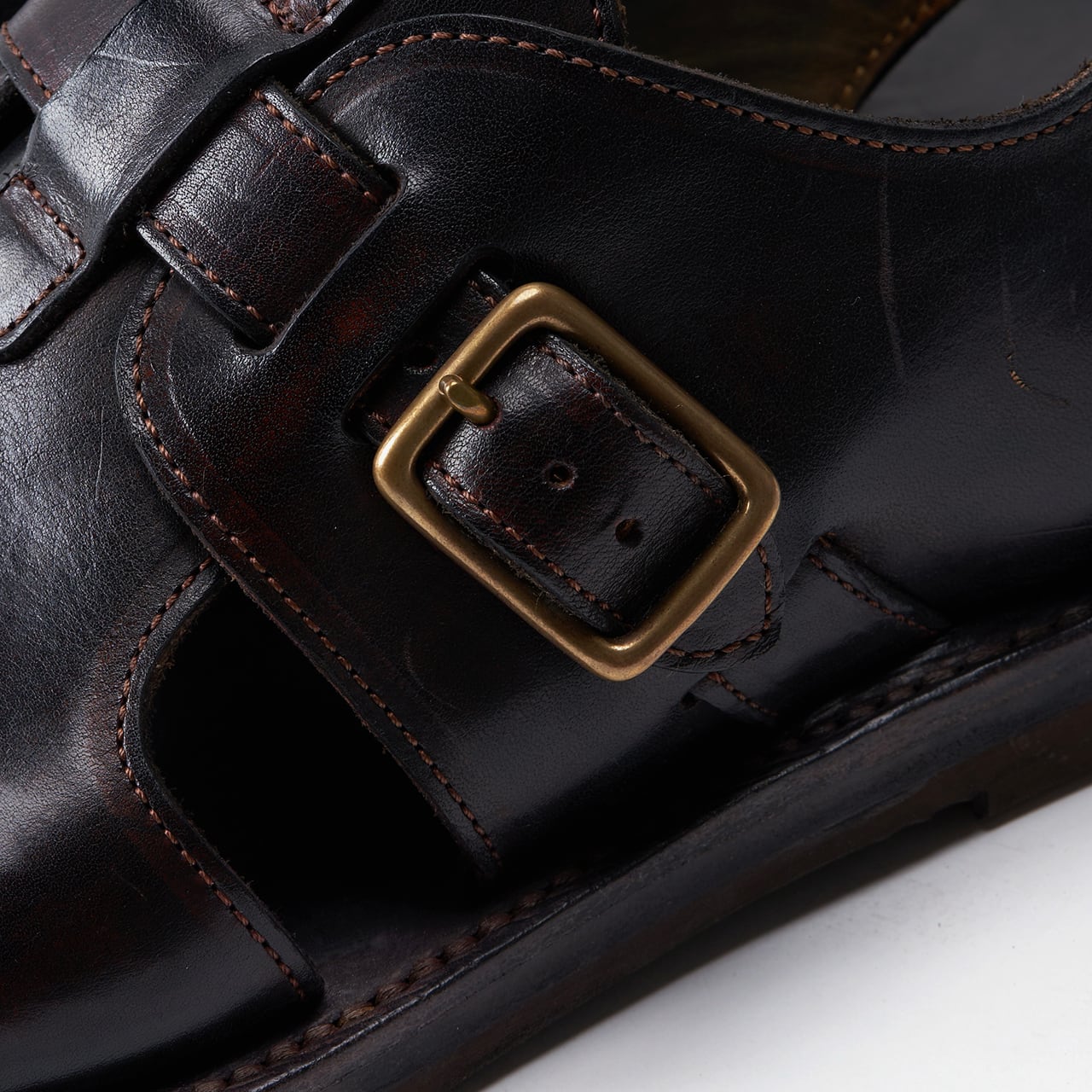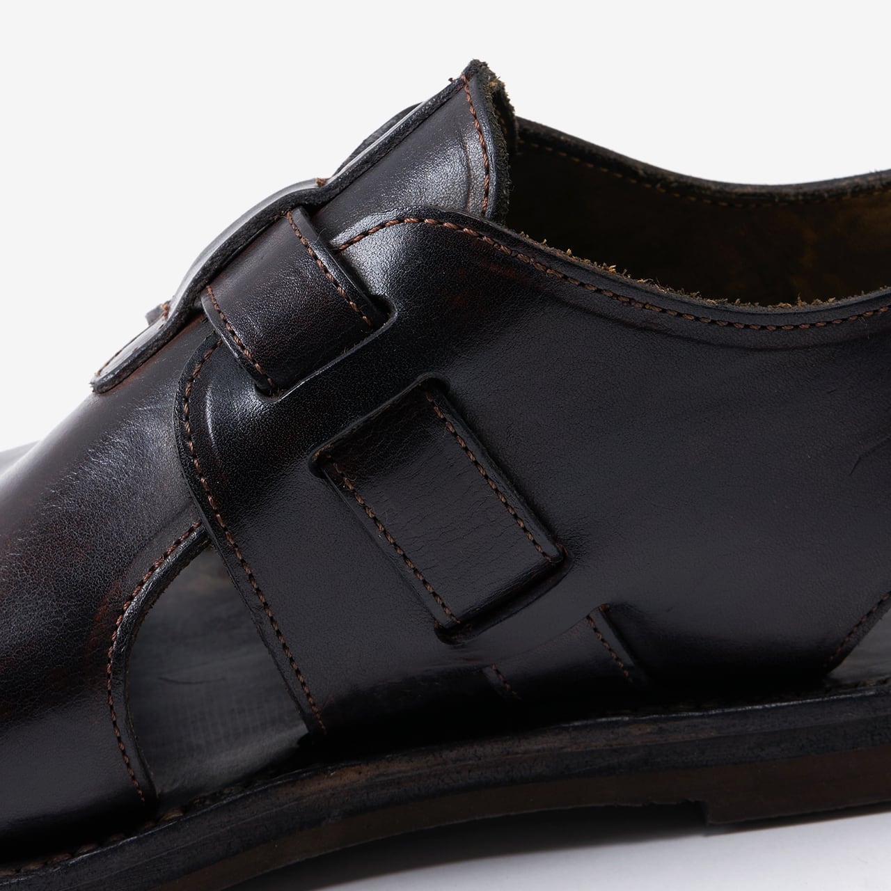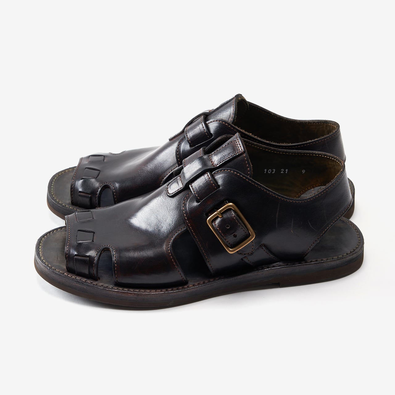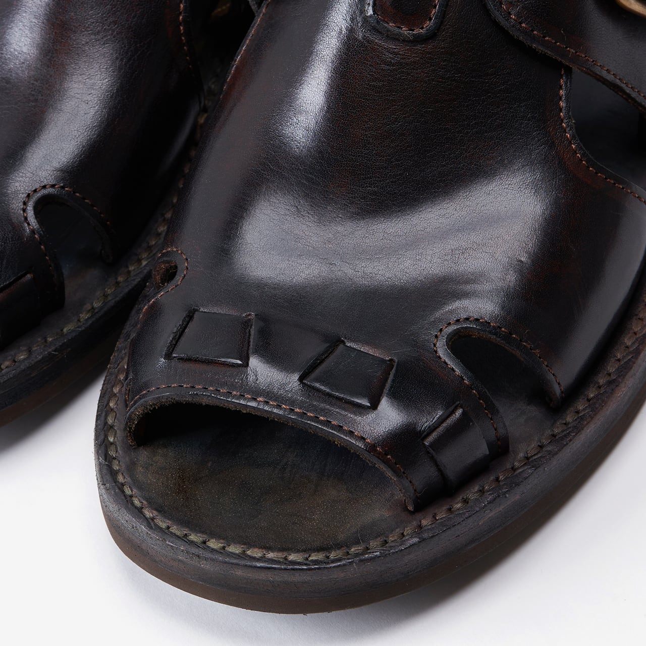 サンダルのような軽快なルックスを持ちつつ、レザーシューズを思わせる重厚感のある定番アイテム。一般的なサンダルのイメージに捉われず、ハンドメイドによる”靴づくり”のノウハウを礎に、靴の木型を使用して製作しています。素材は、イタリア・トスカーナにあるConseria800社のフルベジタブルタンニンレザーを使用。ハンドダイで仕上げている為、奥行きがあるカラーが特徴です。履き込むことで色の変化を楽しむことができます。フィット感や耐久性に優れ、長時間の歩行も快適であり履き心地の良さも秀逸です。